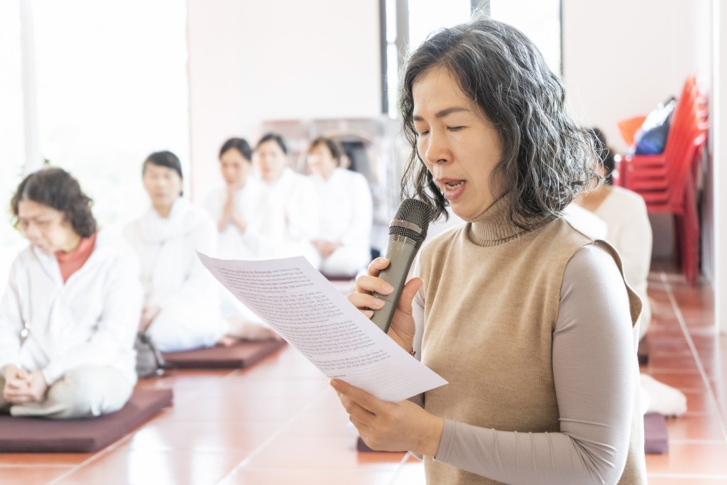 Bà Nguyễn Thị Lan, đại diện cho tập thể thí chủ, các mạnh thường quân phát biểu cảm nghĩ và tác bạch đến Chư Tôn Thiền Đức Tăng.