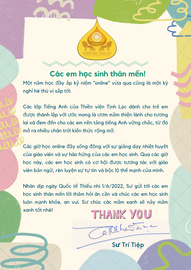 “Các lớp tiếng Anh của Thiền viện Tịnh Lạc được tổ chức với ước mong là gieo mầm thiện lành cho tương lai và đem đến cho các em nền tảng tiếng Anh vững chắc, từ đó mở ra những chân trời kiến thức rộng mở” – trích thư Sư Trí Tiệp gửi các em học sinh lớp tiếng Anh nhân ngày Quốc tế Thiếu nhi.